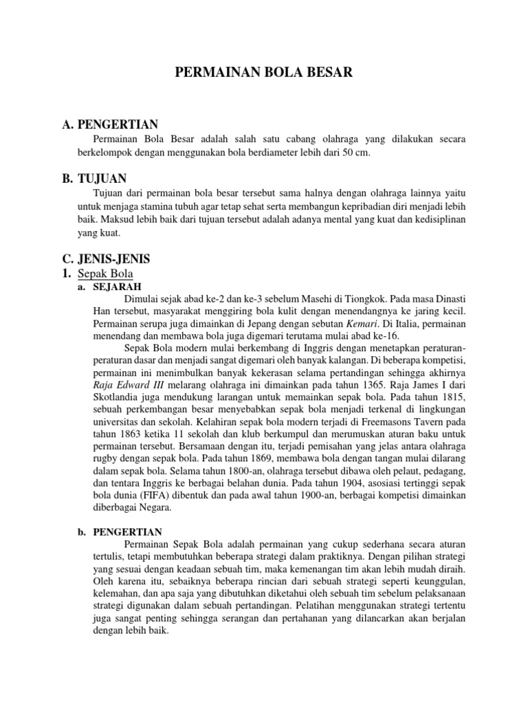 Mulai dari pengertian bola besar dan bola kecil sampai macam macam bola besar dan bola kecil. Menurut agus salim pengertian sepak bola adalah cabang olahraga yang memainkan bola menggunakan kaki dengan tujuan untuk memasukkan bola tersebut sebanyak mungkin ke gawang lawan sesuai dengan ketentuan yang telah ditetapkan sebelumnya baik itu oleh asosiasi sepak bola atau pihak lain yang berwenang.
